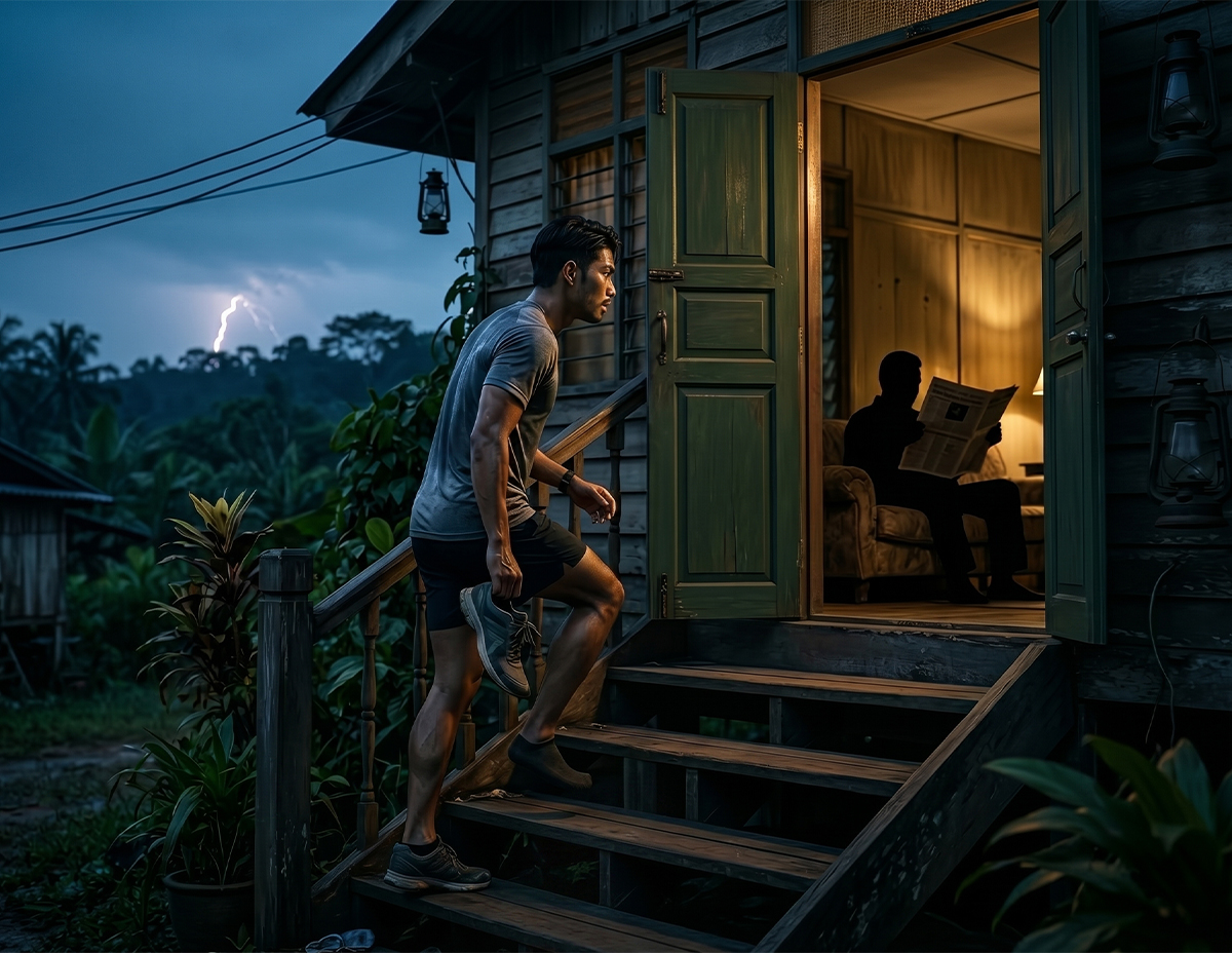 Remang senja semakin dilitupi gelap malam. Johari toleh jam di tangan, sudah hampir pukul 7.45 malam. Sebaik sampai di tangga terus dia membuka kasut dan stoking sambil meluru masuk.
