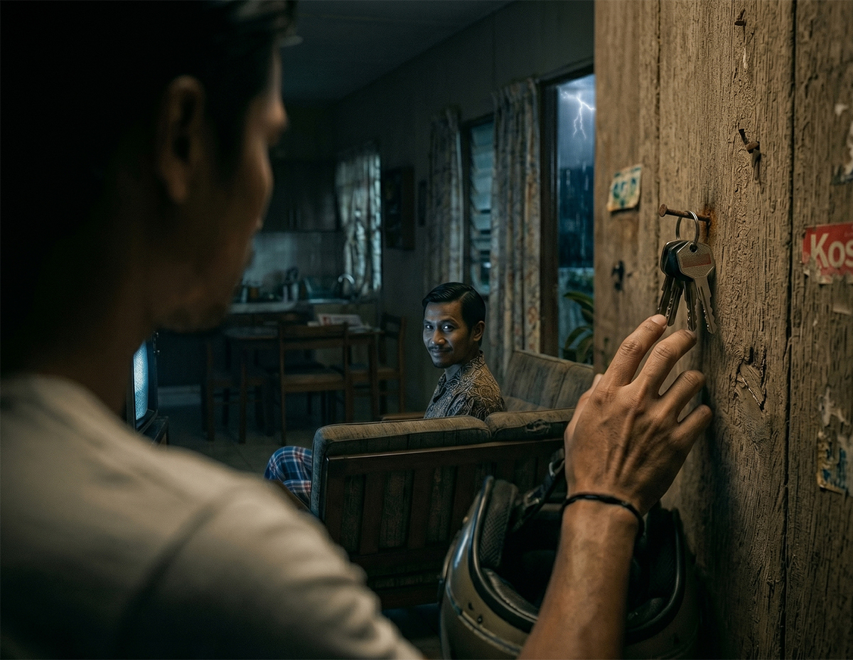 Dilihatnya pintu tidak berkunci, terus dia intai ke arah dalam nampak rakannya Rauf sedang duduk di sofa ruang tamu sambil membelek helaian akhbar yang berada di tangannya.