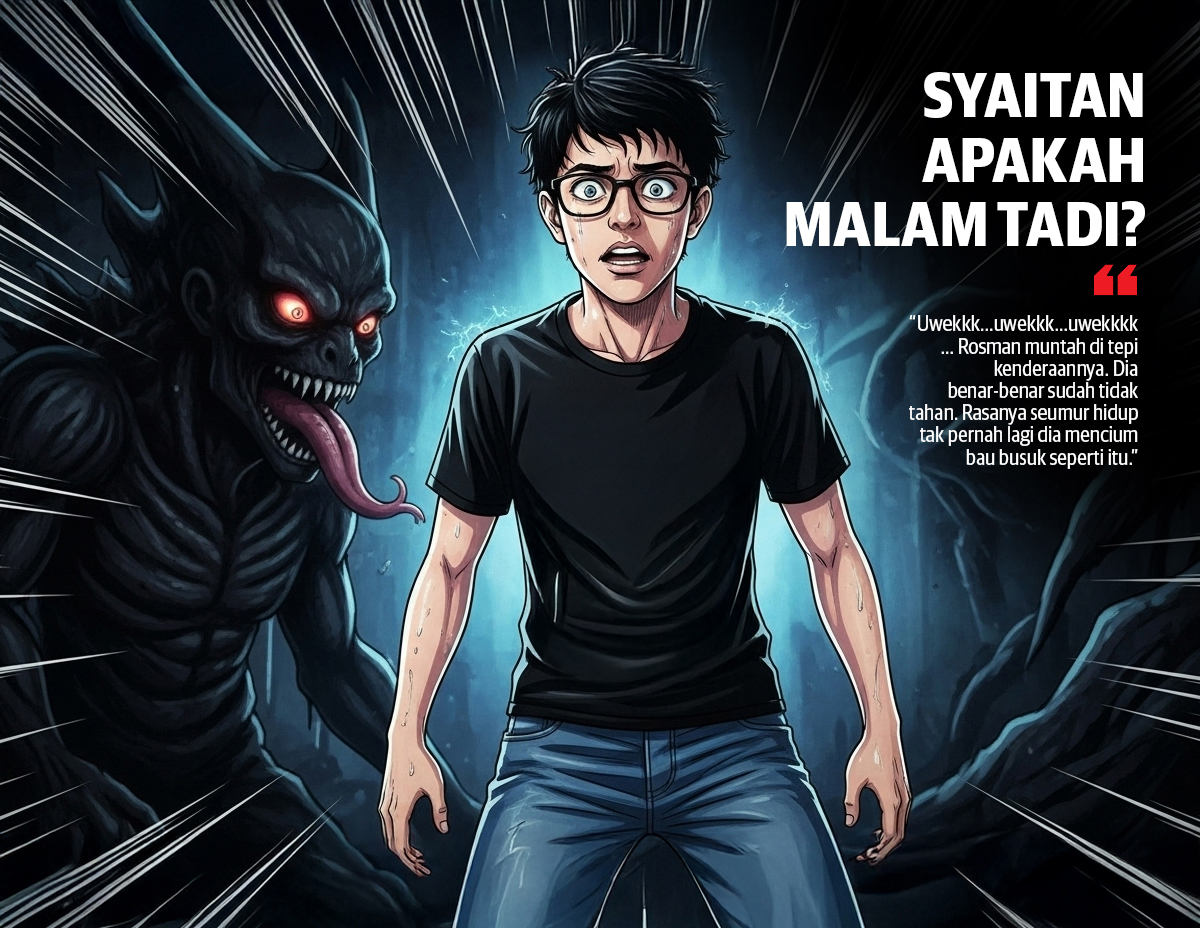 “Uwekkk…uwekkk…uwekkkk… Rosman muntah di tepi kenderaannya. Dia benar-benar sudah tidak tahan. Rasanya seumur hidup tak pernah lagi dia mencium bau busuk seperti itu. Tekaknya berasa kembang dan loya, lantas dia mengambil keputusan untuk masuk semula ke dalam kereta.