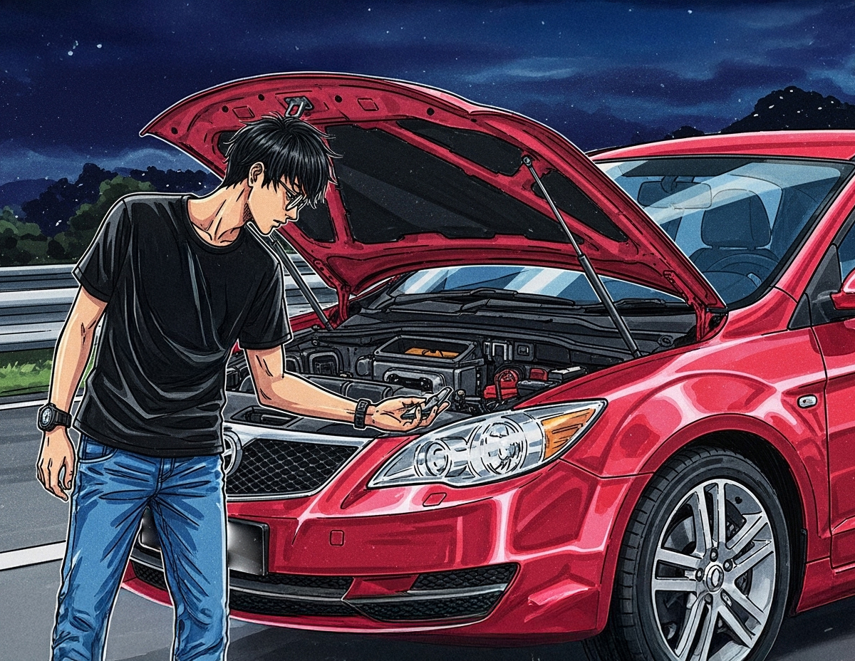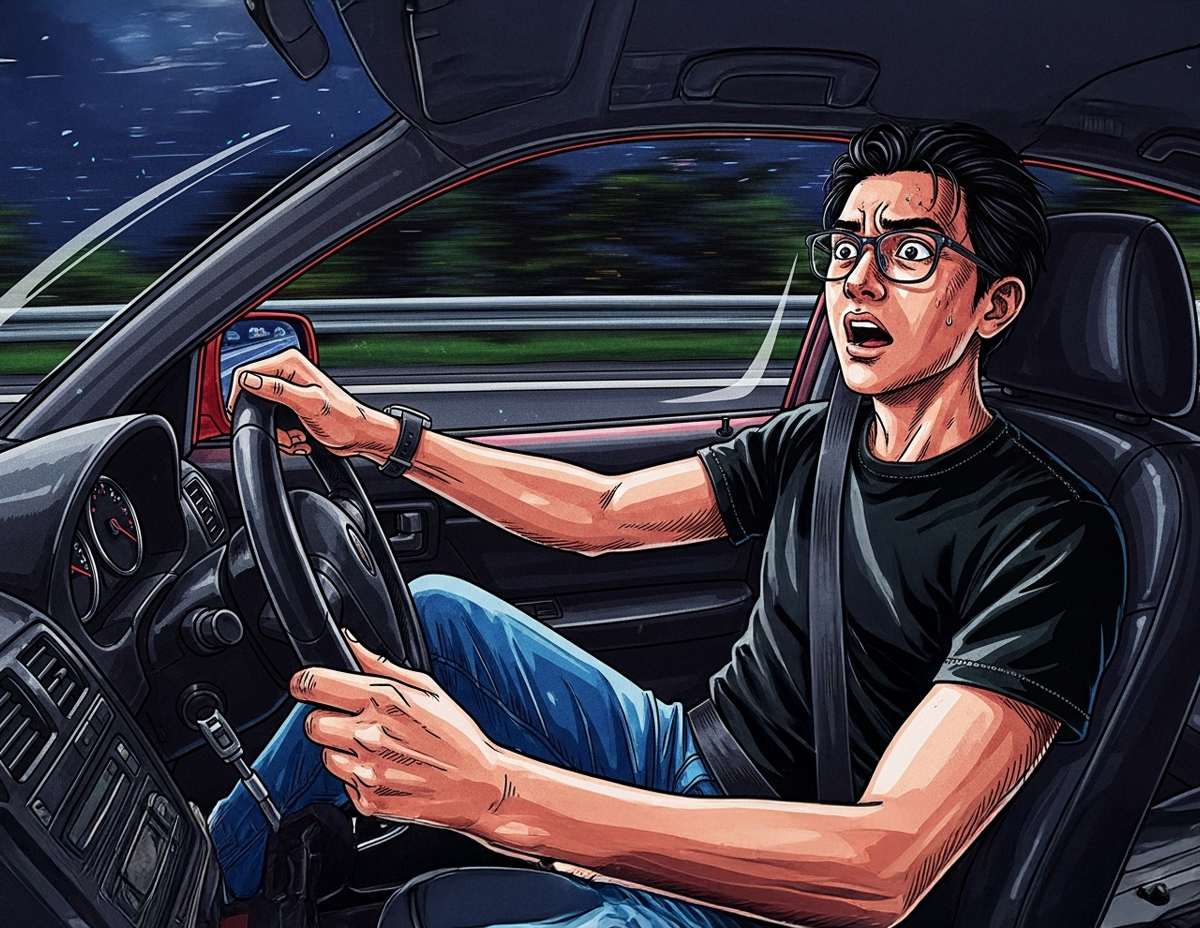 Sedang tekun memandu, tiba-tiba dia tersentak. Entah kenapa enjin keretanya tiba-tiba tersengguk-sengguk seakan mahu mati. Rosman panik. Kakinya lantas menginjak-nginjak pedal minyak, namun tidak berhasil. Enjin kereta yang dipandunya tiba-tiba mati. Dia cemas. Dipulasnya kunci berkali-kali namun tetap tidak berhasil.
