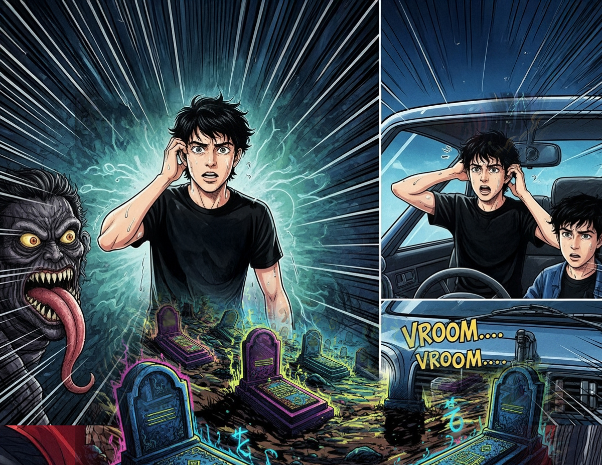 Vroom… vroom… vroom…. Dia garu kepala kehairanan. Ketika kenderaannya baru bergerak beberapa ratus meter ke hadapan, barulah Rosman perasan di sebelah kirinya terdapat tanah perkuburan. Rosman menelan air liur. Tanpa fikir panjang, dia terus memecut keretanya.