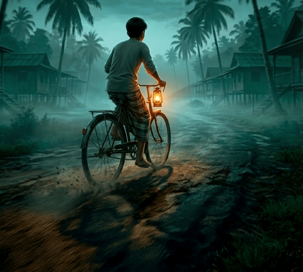 Pada awalnya, dia bercadang untuk bawa lampu suluh tetapi apabila memikirkan kesukaran ketika mengayuh nanti terus dia tinggalkan di tangga rumah.