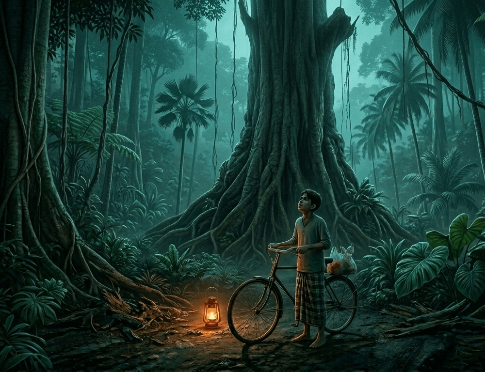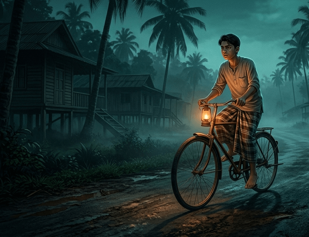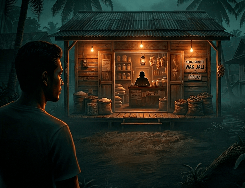 Hampir 20 minit mengayuh dalam gelap akhirnya Zulman sampai juga di kedai runcit Wak Jali. Dia tarik nafas lega bila lihat Wak Jali masih ada di kedai. Selesai membeli barang-barang yang dikirim ibunya, Zulman lantas minta diri dan bergegas pulang.
